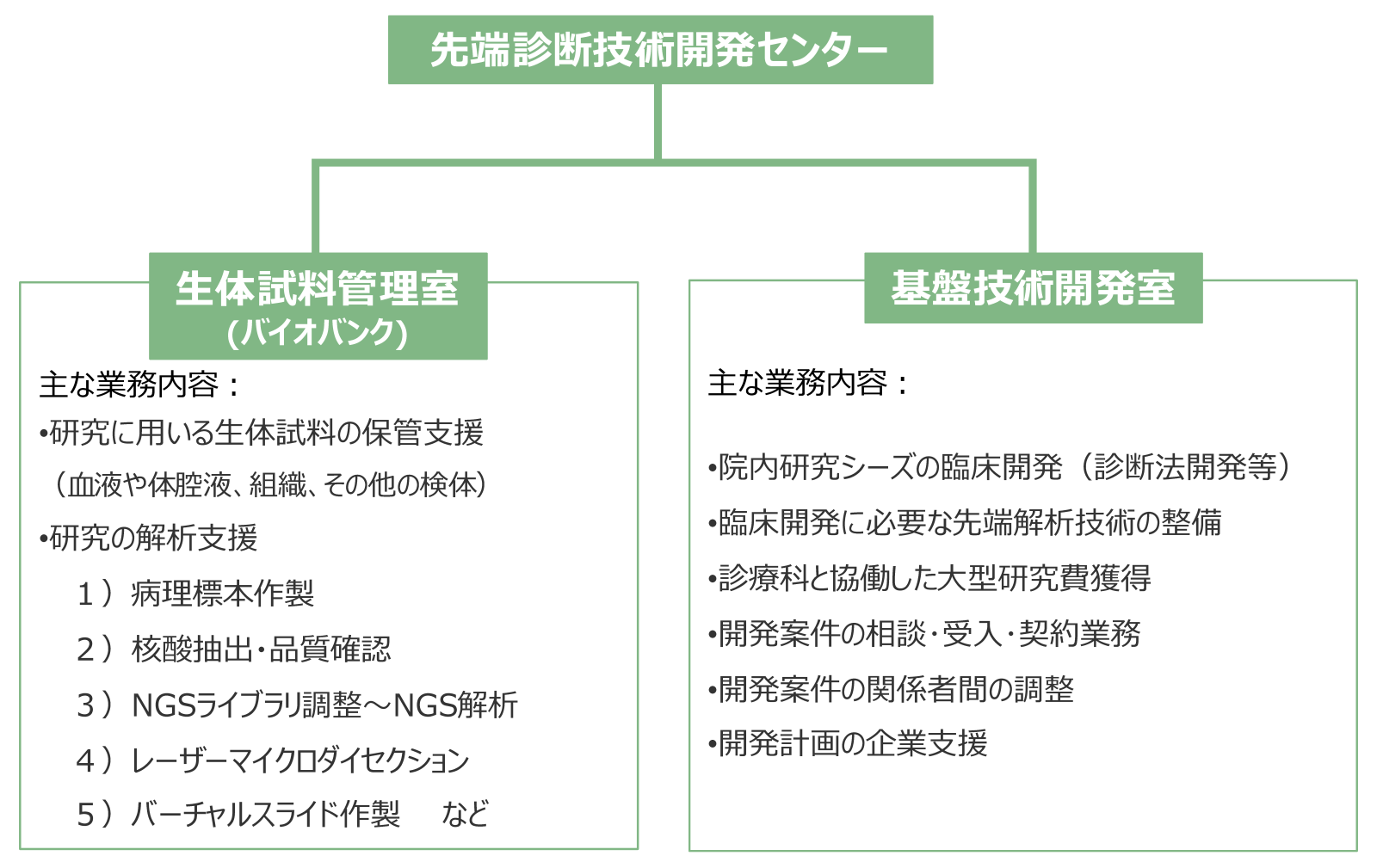 先端診断技術開発センターは,高度化する分子診断技術の臨床導入を目指し,産官学連携のもと体外診断薬・診断用医療機器開発に貢献します。