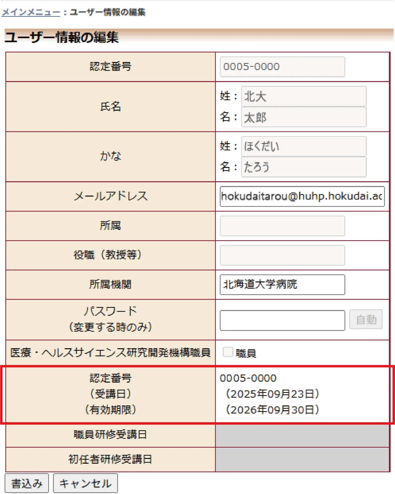 ③「ユーザー情報の編集」の一番下に表示される「認定番号 (受講日)(有効期限)」より確認頂けます。
