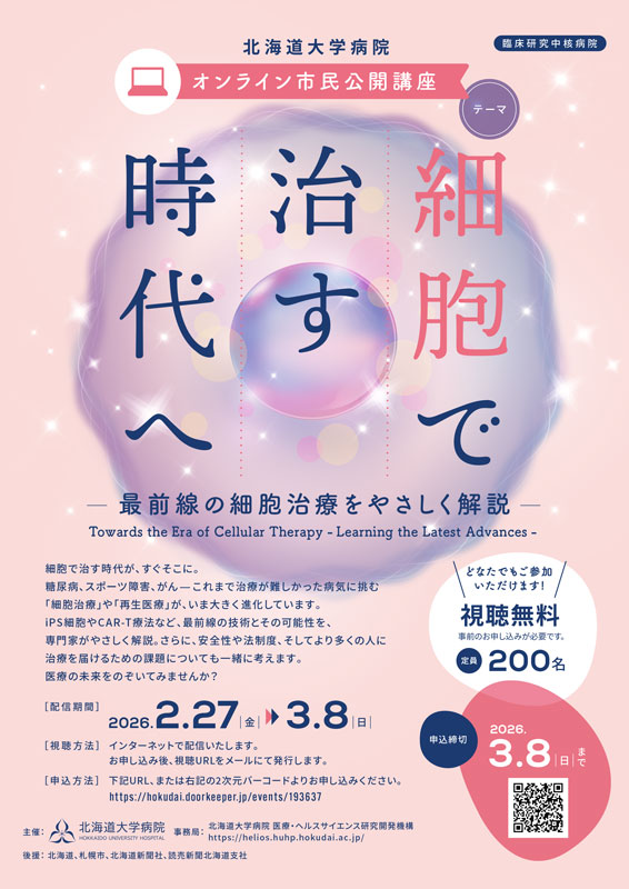 北海道大学病院 オンライン市民公開講座「細胞で治す時代へ〜最前線の細胞治療をやさしく解説」の開催について